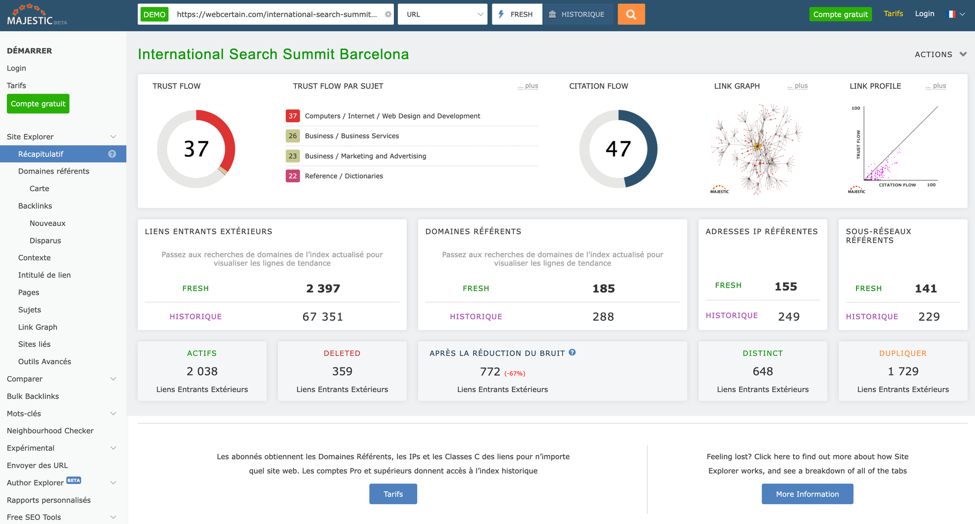Cet outil SEO, historique, est parfait pour analyser les backlinks. Son interface est simple et permet de renseigner le nom de domaine que ce soit le vôtre, celui de votre client ou d’un concurrent. Deux critères sont utilisés : le Trust Flow (un indice de confiance établi sur la qualité des liens) et le Citation Flow (il quantifie les liens entrants).