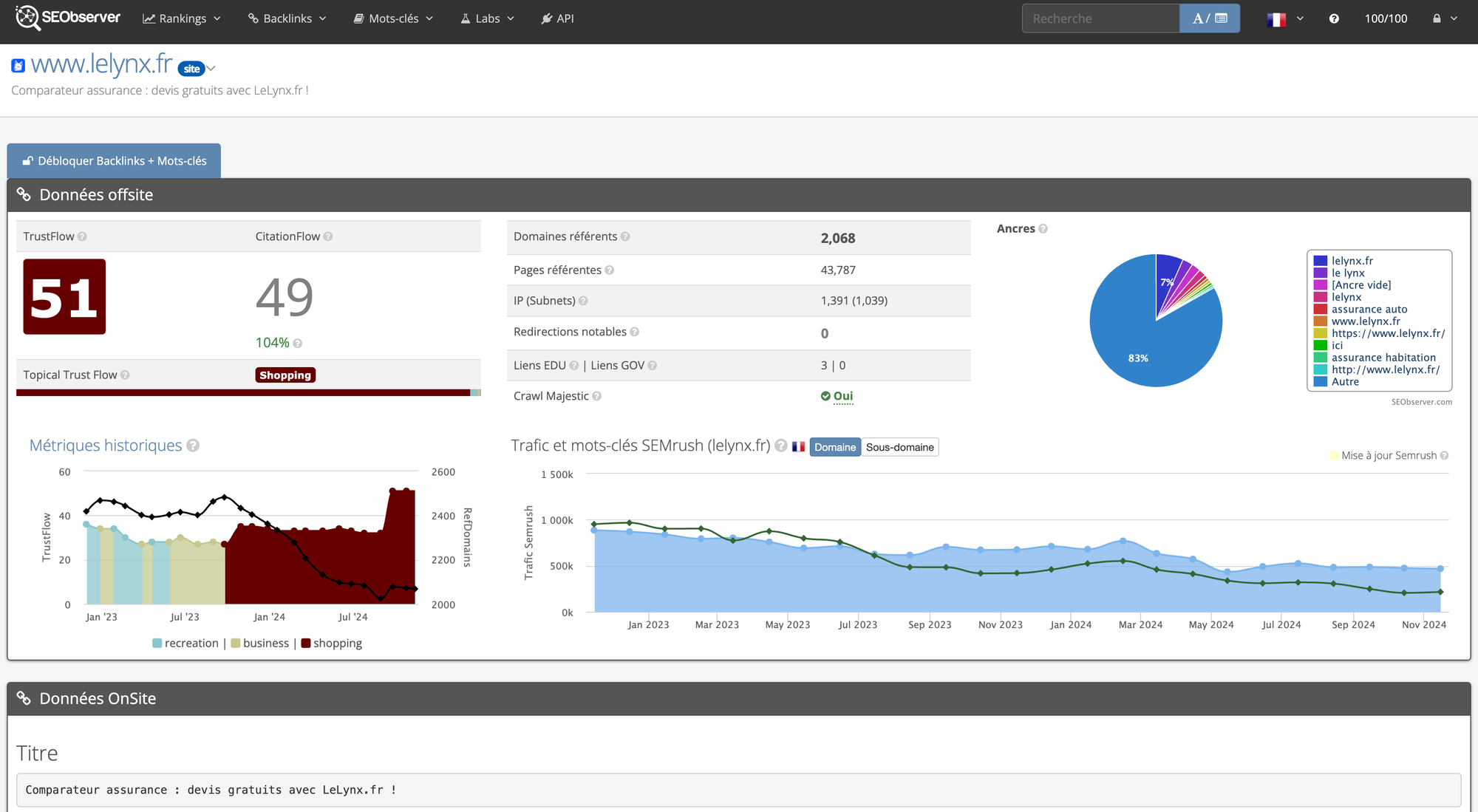 C’est l’un des outils SEO Français indispensable (on l'utilise au quotidien chez Linkuma) dans le domaine du référencement naturel pour surveiller et explorer tous les backlinks. Il utilise à la fois la donnée de Majestic pour les backlinks (plus haut), ainsi que SEMRush pour les mots clés et l'estimation du trafic ; tout en possédant également sa propre base de donnée.