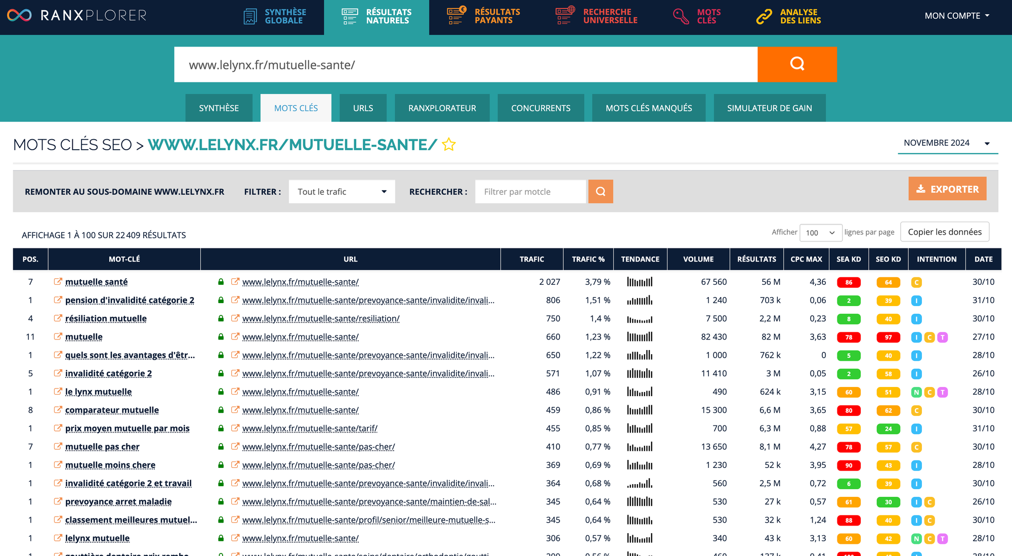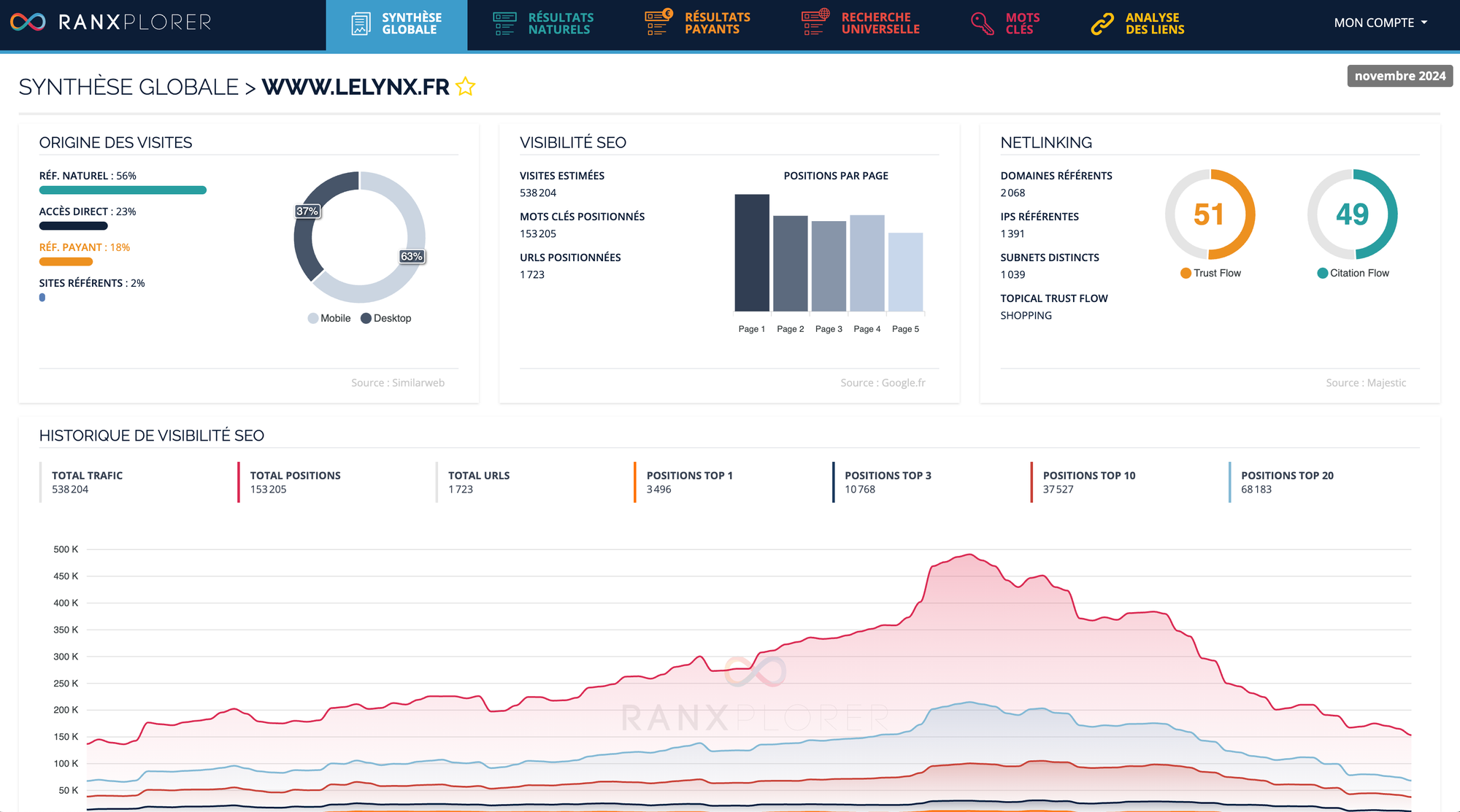 Si de nombreux outils SEO sont souvent pointé du doigt pour leurs tarifs élevés, il existe une alternative pertinente : Ranxplorer. Renseignez le nom de domaine et obtenez de multiples informations avec une synthèse globale qui reprend le nombre de visites, de mots-clés et d’URLs. Résultats naturels, payants, recherche universelle, mots-clés et étude de liens sont au programme. Tout est aussi au rendez-vous pour créer un joli cocon sémantique.