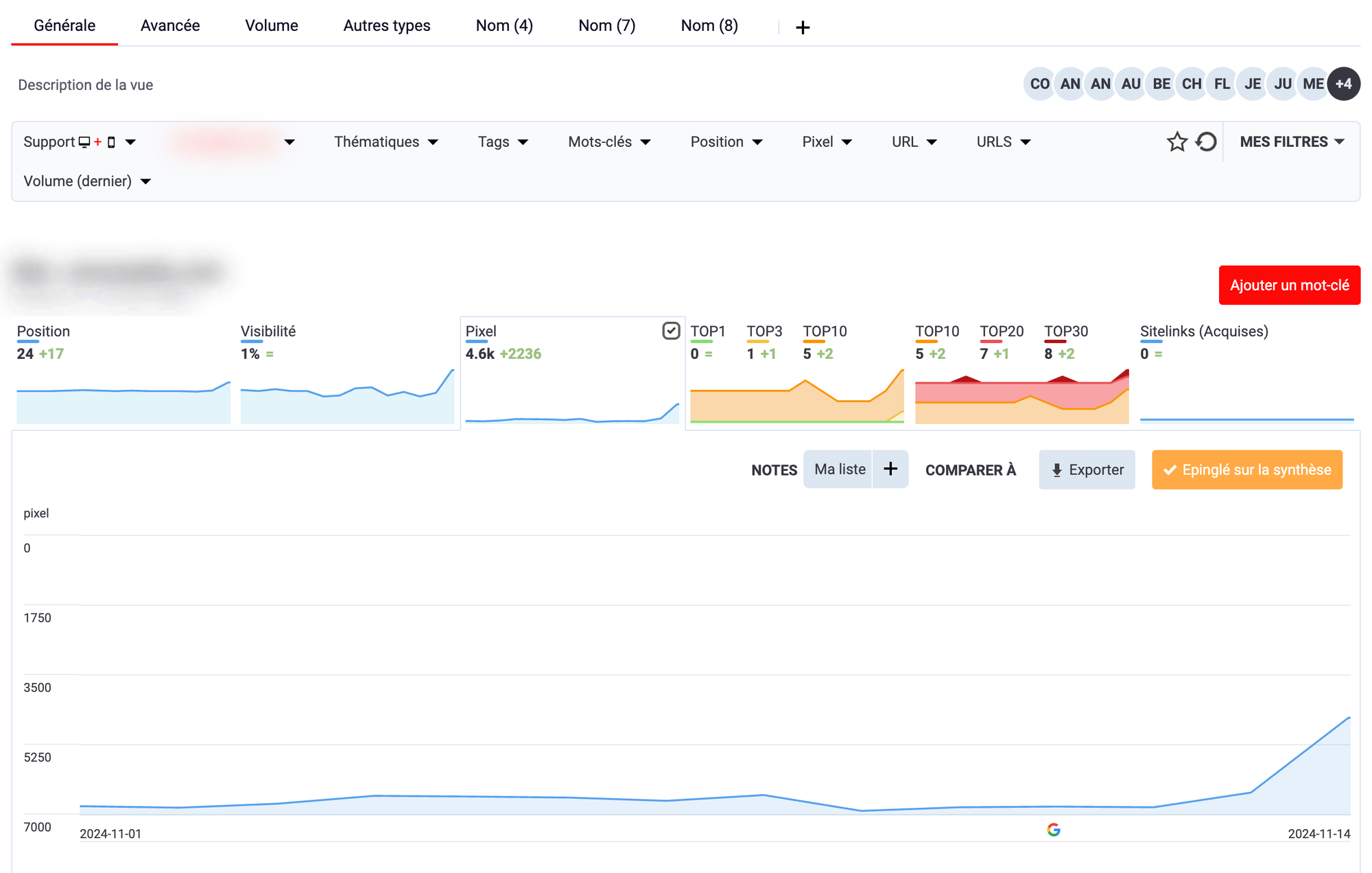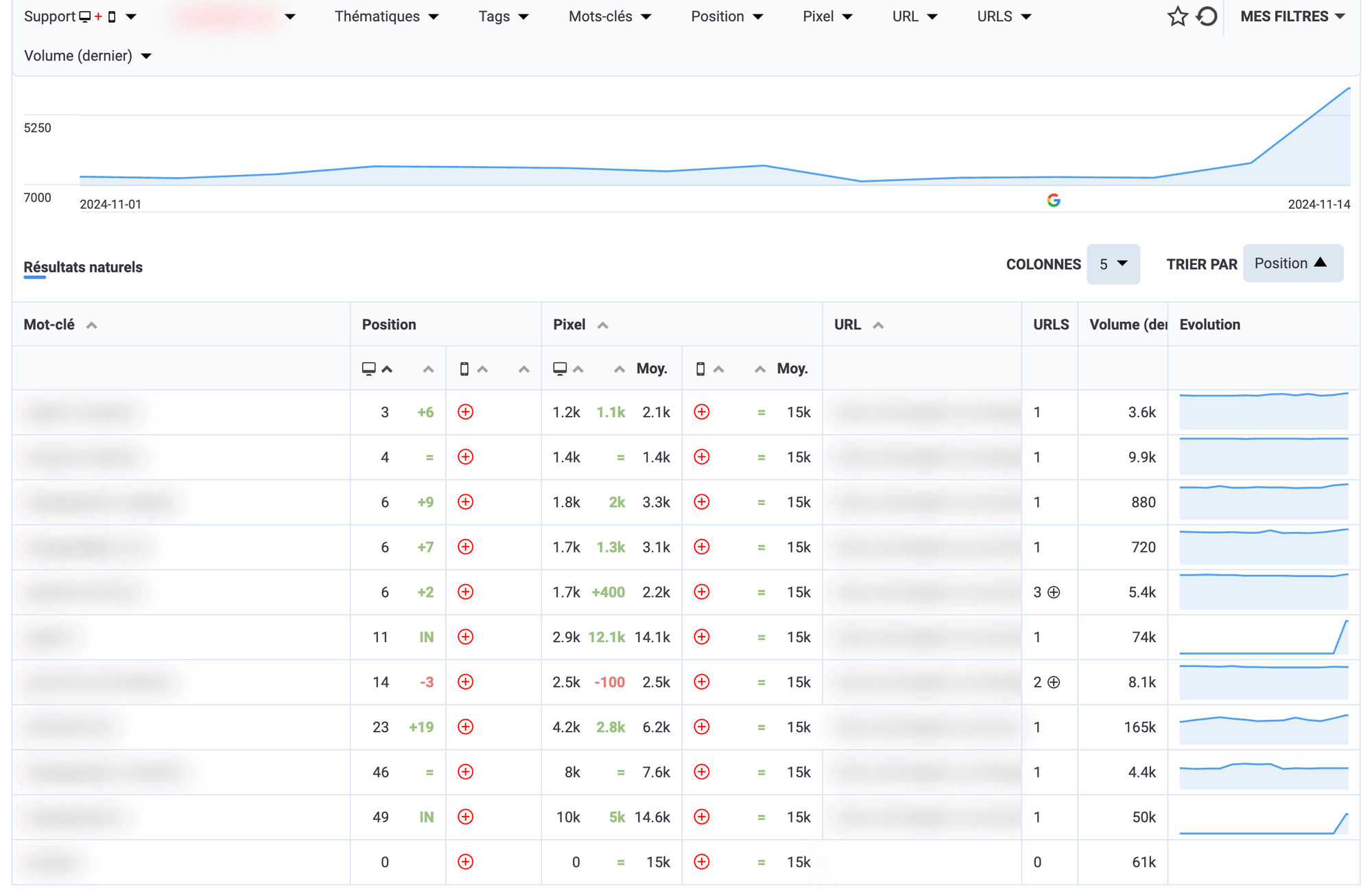Suivre les positions d'un site, d'URLs précises ou d'un article et de ses concurrents est le point de départ pour lancer et adapter ses stratégies SEO. Cet outil est l'un des rares à récupérer la SERP Google en pagination. De nombreuses metrics sont disponibles telles que la position moyenne, la position pixel, les URLs cibles et biens d'autres pour personnaliser votre interface.