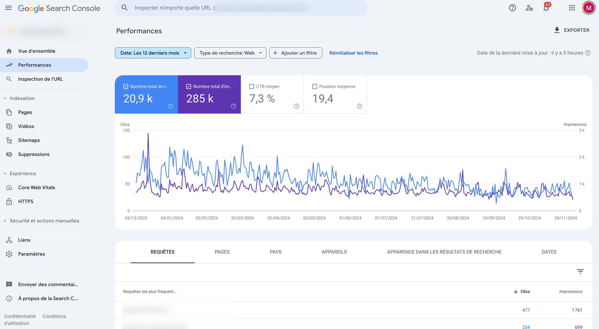 Difficile de parler d’outils SEO sans évoquer la Search Console. Pour étudier la santé de votre site, elle est précieuse. Plusieurs indicateurs sont disponibles sur les Core Web Vitals, l'indexation, mais également les mots clés, avec impression, clics, ...