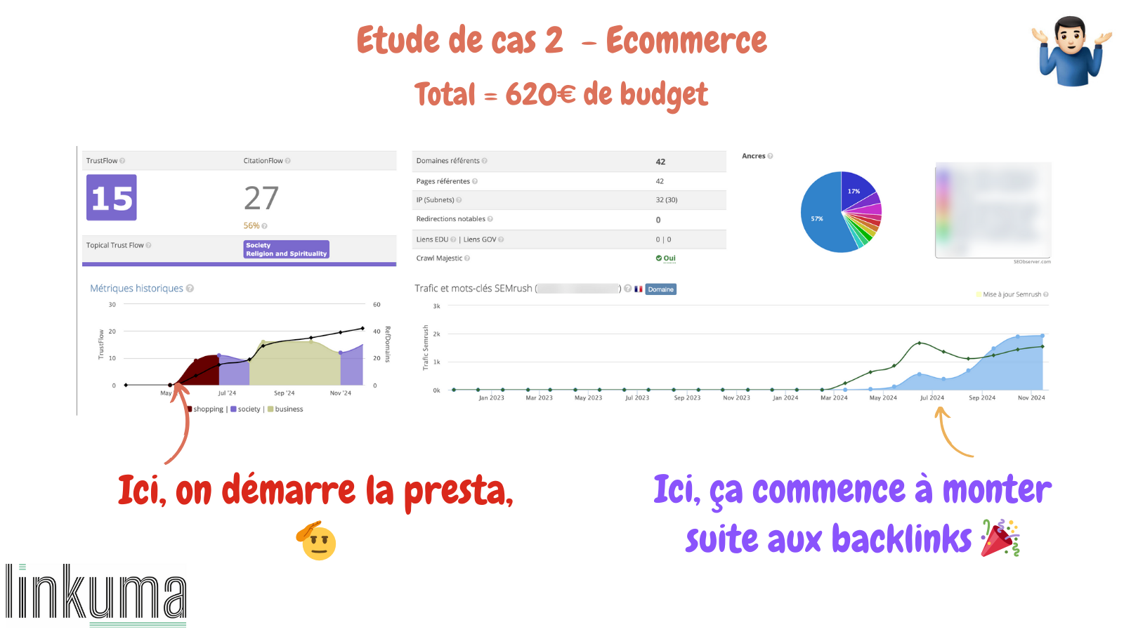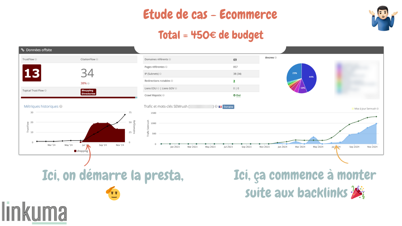 450 euros de budget au total, avec des optimisations SEO par le client, des backlinks, sans forcer et dans le temps. Et les résultats sont au rendez-vous, sur un e-commerce avec une entreprise derrière.