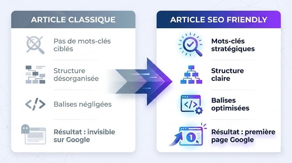 À la différence d'un texte classique publié sans réflexion sur le référencement naturel, ce type d'article intègre des mots-clés stratégiques, une structure claire et des balises optimisées. Google comprend alors précisément le sujet traité et positionne la page sur les requêtes pertinentes.