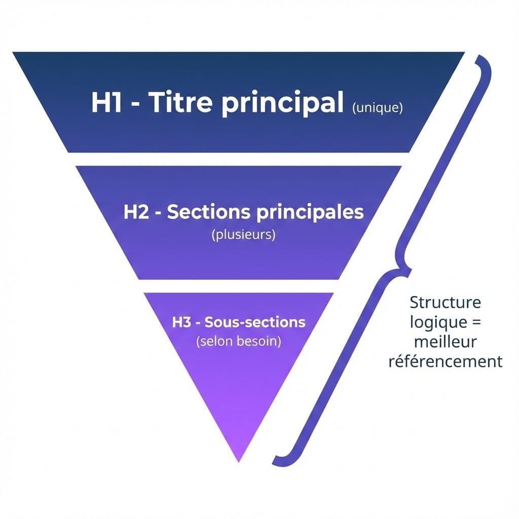 Les balises HTML H1, H2 et H3 aident les moteurs de recherche à comprendre l'architecture de votre article. Le H1 correspond au titre principal : il doit être unique sur chaque page. Les H2 découpent ensuite les grandes parties de votre contenu, pendant que les H3 détaillent les sous-sections.