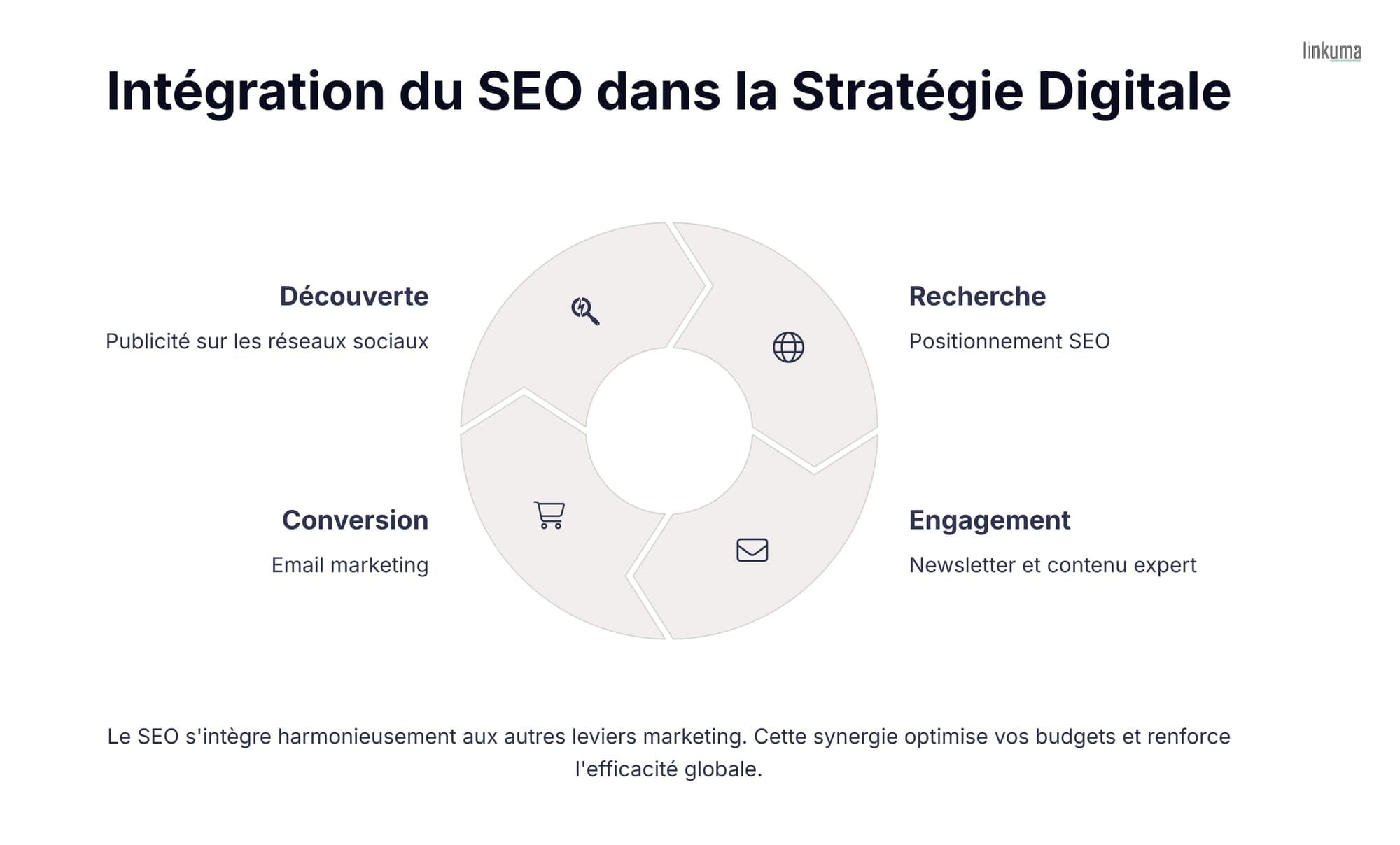 Le SEO ne fonctionne pas en vase clos. Une stratégie digitale performante intègre harmonieusement le référencement naturel aux autres leviers marketing numériques.