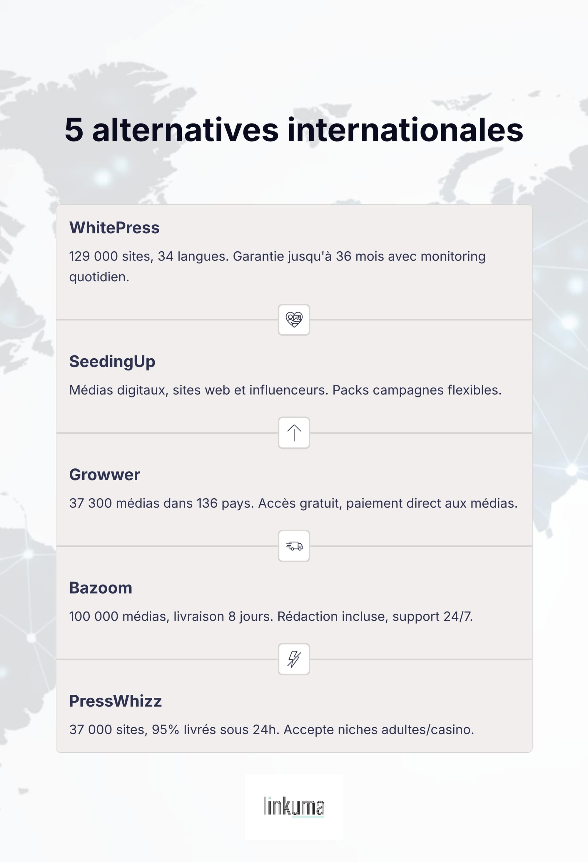 Link Finder est une alternative intéressante si vous cherchez à comparer les prix et les offres du marché avant d'acheter des liens. Les autres plateformes présentées répondent à des besoins spécifiques : WhitePress excelle sur l'international, SeedingUp séduit par sa flexibilité, Growwer mise sur l'accès direct aux médias, Bazoom propose un service complet et PressWhizz joue la carte de la rapidité.