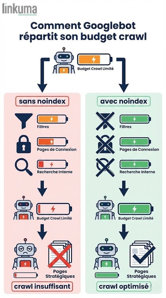 Sans utilisation de noindex sur les contenus de faible qualité, le moteur de recherche gaspille son temps d'exploration sur des pages sans intérêt SEO :