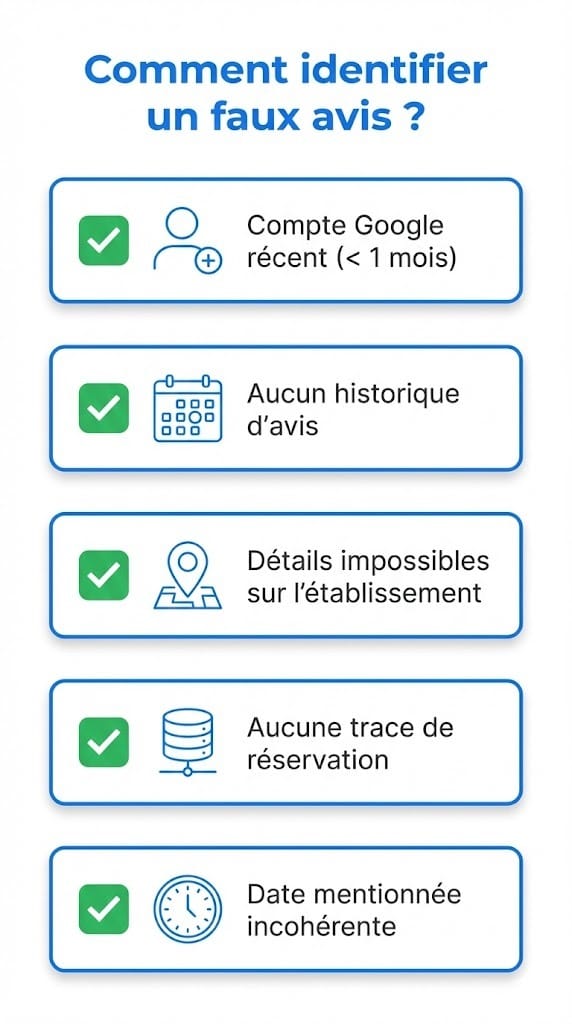 Plusieurs indices vous alertent rapidement : un client qui prétend être venu alors que vous n'avez aucune trace de sa visite, des détails impossibles sur votre établissement, ou encore un compte Google créé récemment sans aucun historique d'avis. Ces éléments pointent vers un faux commentaire.