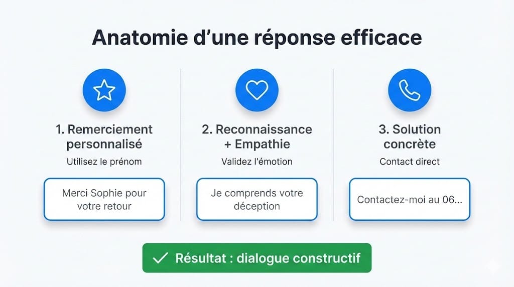 Une réponse efficace suit toujours la même architecture, quelle que soit la plateforme utilisée. Cette méthode fonctionne sur Google Maps, Facebook, TripAdvisor ou n'importe quel site d'avis clients. Mieux encore, vous appliquez exactement cette structure dans vos échanges privés par mail ou téléphone avec les clients mécontents.