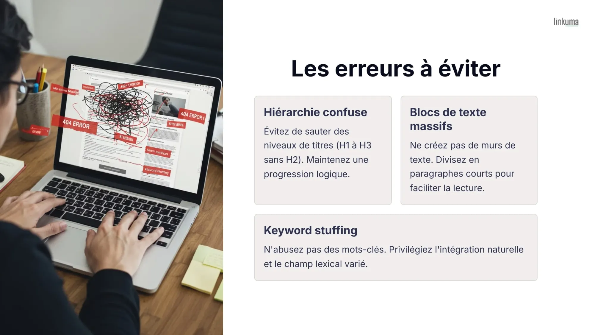Une structure d'article optimisée pour le SEO fonctionne seulement si vous évitez certains écueils fréquents. Notre expérience chez Linkuma nous a montré que même certains rédacteurs web expérimentés commettent ces erreurs qui diminuent l'efficacité de leur contenu. Voici les pièges les plus courants et comment les corriger :